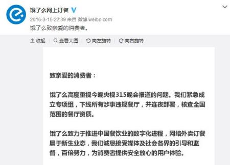 “餓了么”被曝光當天回應稱,其高度重視問題,已經緊急成立專項組,下線所有涉事違規(guī)餐廳,并連夜部署,核查全國范圍的餐廳資質。