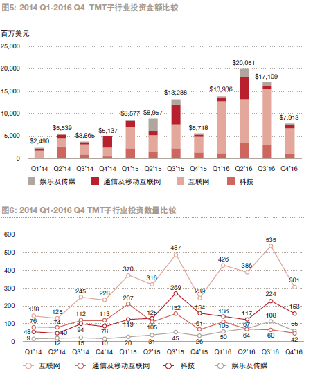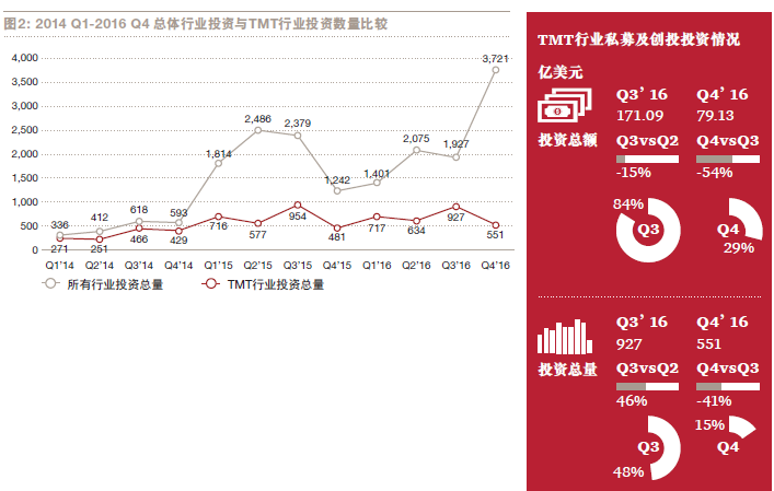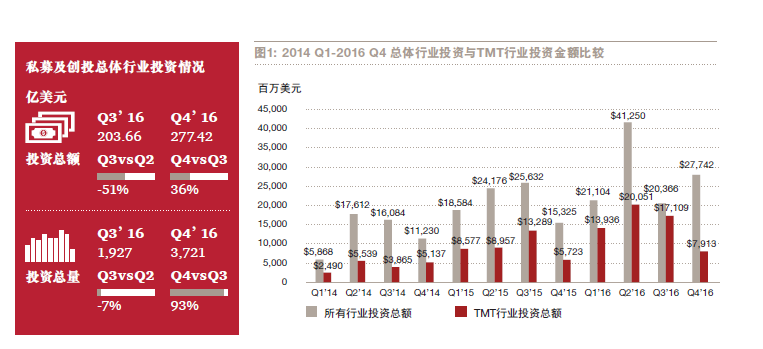 根據(jù)普華永道發(fā)布的MoneyTreeTM報(bào)告顯示,2016 年下半年私募及創(chuàng)投(PE/VC)總體投資和在科技、媒體及通信(TMT)行業(yè)的投資數(shù)量都創(chuàng)下自2012 年以來的半年度的新紀(jì)錄,同期兩者投資總額都有所回落,市場(chǎng)趨于理性。
