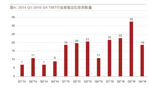 2016 第四季度,TMT行業(yè)投資金額和數(shù)量都不出意外地大幅下滑,金額占總體PE/VC 投資總額的29%。但是2016 年下半年,TMT行業(yè)投資總額占總體行業(yè)比例依然維持半數(shù)以上,最高單筆投資金額達(dá)到了40 億美元。