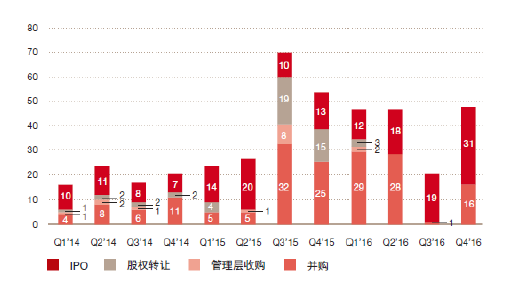 根據(jù)報(bào)告顯示,2016 年下半年IPO數(shù)量大幅增長,三季度TMT行業(yè)投資通過IPO退出占比達(dá)到了95%,四季度也維持在六成以上,成為了下半年資本退出的主要方式,自2015 年三季度以來首次超過并購。2016 年下半年,沒有發(fā)生管理層收購及股權(quán)轉(zhuǎn)讓案例。