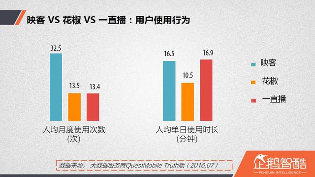 在數(shù)據(jù)監(jiān)測(cè)中,我們看到無論從活躍用戶規(guī)模、活躍率以及產(chǎn)品的使用黏性看,映客均領(lǐng)先于花椒和一直播。但這并不意味映客已經(jīng)建立了競(jìng)爭(zhēng)壁壘,其3800萬的月活躍用戶規(guī)模,從市場(chǎng)的滲透率來看,還留有很大市場(chǎng)空間供競(jìng)爭(zhēng)者來獲取。