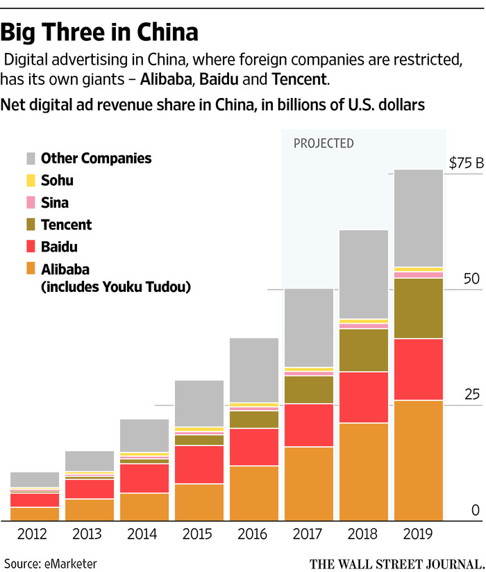 據(jù)市場研究公司eMarketer發(fā)布報(bào)告稱,今年中國數(shù)字廣告市場規(guī)模將達(dá)到500億美元,百度公司、阿里巴巴集團(tuán)以及騰訊控股(BAT)將占據(jù)其中的62%以上。到2019年時(shí),中國數(shù)字廣告市場規(guī)模將達(dá)到760億美元,BAT占據(jù)70%。