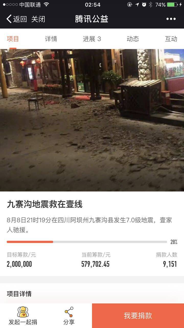 本次災情發(fā)生后,騰訊公益上線“九寨溝地震救在壹線”籌款項目,截至9日2點55分,已經(jīng)籌款579,902.45元。