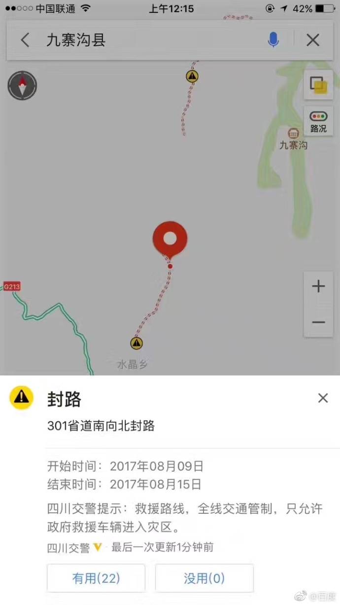 此外百度地圖已更新了九寨溝最新的路況信息: