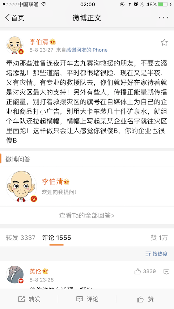不過,也正如成都著名評書表演藝術家@李伯清 在微博中的號召,“演員”就不要再在擁擠的救援道路上添亂了: