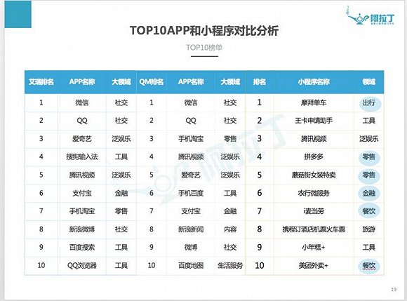 根據(jù)阿拉丁公布的數(shù)據(jù),排名2017年Q2 Top10的小程序和APP對(duì)比