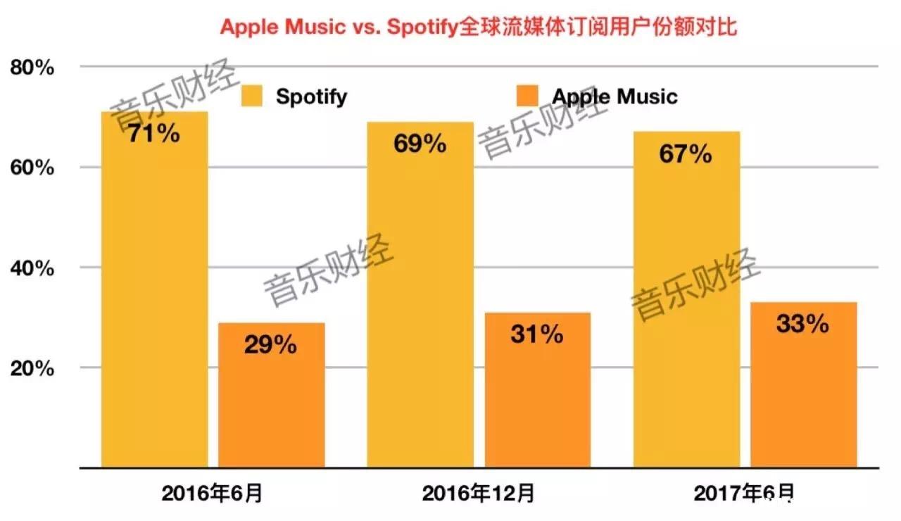 雖然Apple Music的增長率要比Spotify略高,但訂閱用戶總量距離Spotify仍舊有巨大差距。唯一一點(diǎn)值得蘋果欣慰的是,Apple Music在全球訂閱用戶總體體量的份額正在慢慢上升。