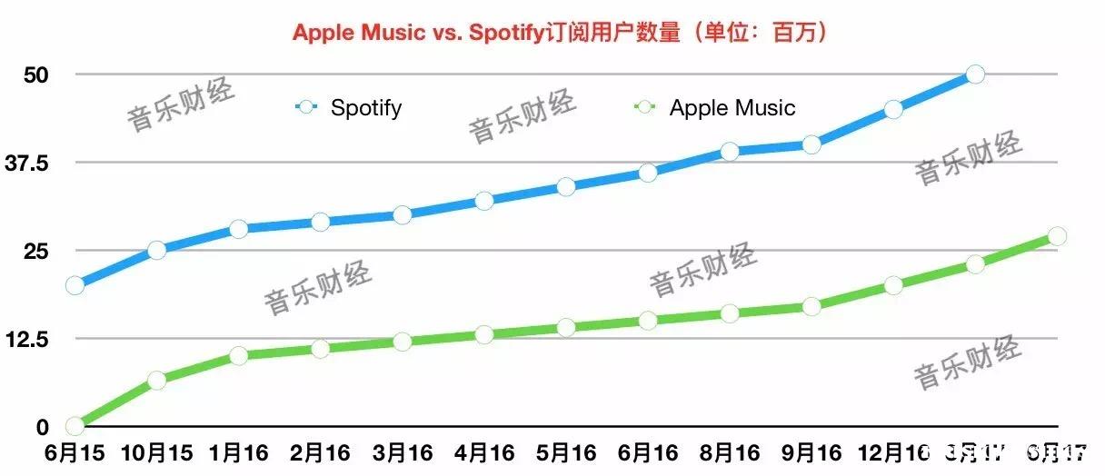 但是轉(zhuǎn)觀Apple Music最大的競爭對手Spotify,今年3月初其訂閱用戶超過了5000萬,這也意味著,Apple Music在半年之內(nèi)的用戶增長量達(dá)到了1000萬(去年9月為4000萬用戶),平均每個(gè)月的用戶凈增長達(dá)到了180萬左右。