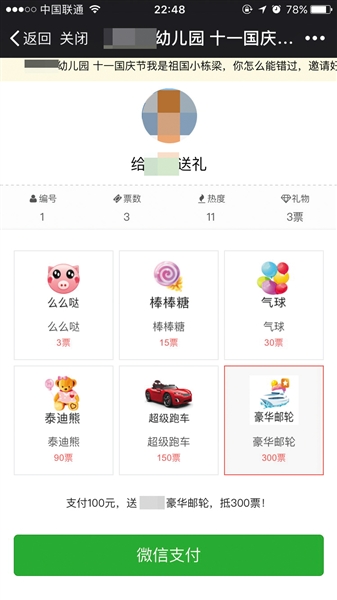 張弦說(shuō),花3塊錢送“棒棒糖”可以增加15票,另外還有10元、50元、100元和300元的禮物,其中100元和300元可以買“超級(jí)跑車”和“豪華郵輪”,對(duì)應(yīng)的票數(shù)為500票和1500票。